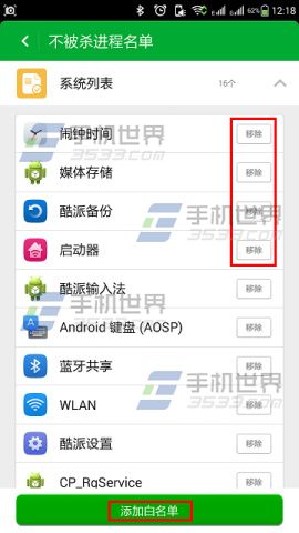 2)点击【不被杀进程名单】,在该功能界面我们可以根据自己的需求选择【移除】或者【添加白名单】。(如下图)