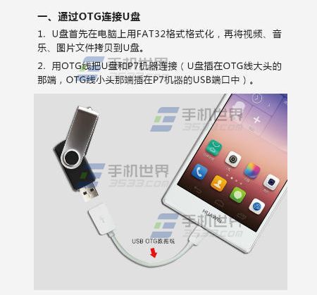 1)准备一条OTG线及FAT32格式的U盘。将OTG线及U盘跟华为G7连接。(如下图)