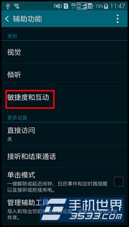 1)打开三星S6手机【设定】点击【辅助功能】,选择【敏捷度和互动】功能。(如下图)
