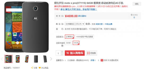 如果你喜欢Nexus 6,昨天摩托正式公布了Moto X Pro,而它也将会在今天上午10点无预约正式开卖(京东、苏宁、摩托罗拉官网)。至于Moto X Pro的售价,官方公布的售价与我们之前独家曝光完全一致,32GB版本价格为4299元,而64GB版本是4699元,相对来说还是可以。Moto X Pro配置相当彪悍,配备了6寸2K屏(分辨率1440×2560像素),搭载2.7GHz四核骁龙805处理器和3GB内存,内置1300万像素摄像头和32/64GB存储空间(可扩展),运行Android 5.0系统。