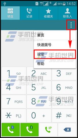 1)打开三星A7手机【电话】,点击【三点】选择【设定】。(如下图)