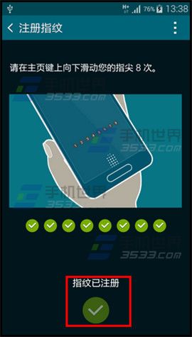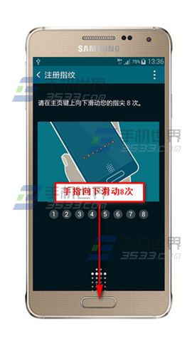 3)手指从屏幕中心位置向下滑动8次进行记录指纹识别。(如下图)