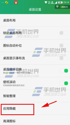 1)在待机界面时,点击大神F1极速版【HOME键左边的物理菜单键】,点击【桌面设置】,选择【应用隐藏】。(如下图)