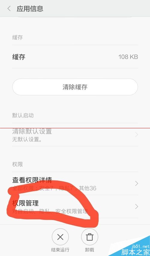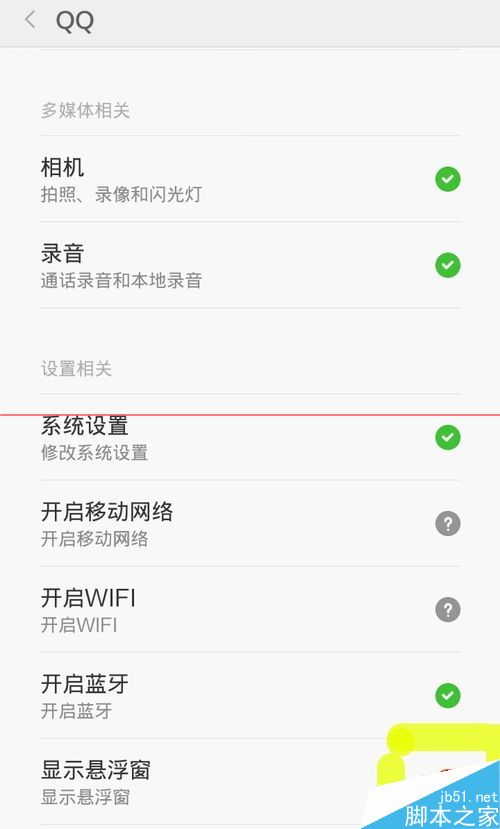 3、点开权限管理,你会看到一些选项,往下面拉,你会看到有这么一个选项,打开悬浮窗。这些选项的右侧有的是x号,有的是对号。叉号为关闭,对号为开启。