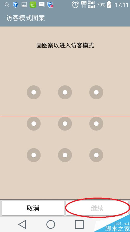 5、接下来是一个非常关键的步骤,我们需要为”访客“设定不同的屏幕解锁模式。如示例中是地图形方式解锁屏幕的。注意一定要保证”访客“屏幕与主屏幕的解锁图案不一样,设置完成后,点”继续“保存配置。这样在屏幕锁定的情况下,使用不同的解锁图案,就会进入相应的桌面。