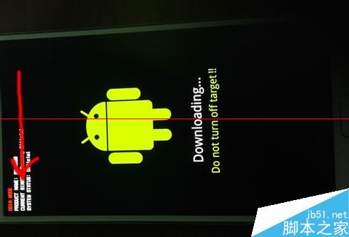 4、查询有无刷机。关掉手机。然后同时按下按电源键、音量下键、HOME键,然后会弹出“警告”等,按音量上键查看,出现新的画面为安卓机器人,最上方有四行小字,找到第三行(图中箭头所指),看最后的单词是yes还是no,如果是no,证明没有刷过机。