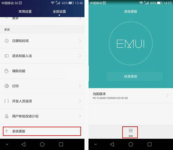 3,在全部设置中,往下拉,然后再点击进入【系统更新】界面。在系统更新页面中,找到下方的【菜单】按钮,点击一下会出现三个选泽栏,如下图所示:
