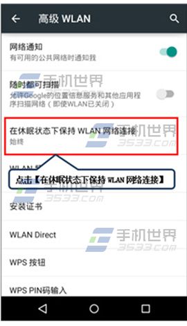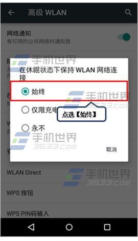 2)将【在休眠状态下保持WLAN网络连接】设置成【始终】。(如下图)