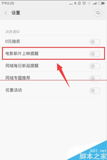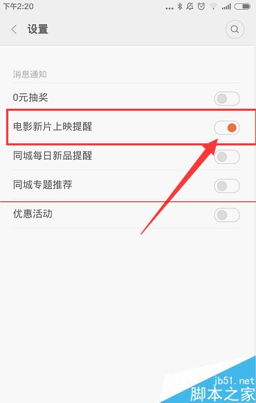 5、点击开启电影新片上映提醒,如图,按钮会从灰色变为红色的状态。即成功开启设置。