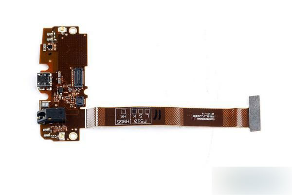 G Flex2的副板也与上一代采用软硬结合板的结构不同,整体采用了咖啡色软板结构,软板正面集成了主天线金属触点,一颗RFMD的RF1149A天线开关芯片,显示屏和触摸屏连接器接口、USB接口和3.5毫米耳机孔,背面采用绝缘胶粘贴在中框底部。