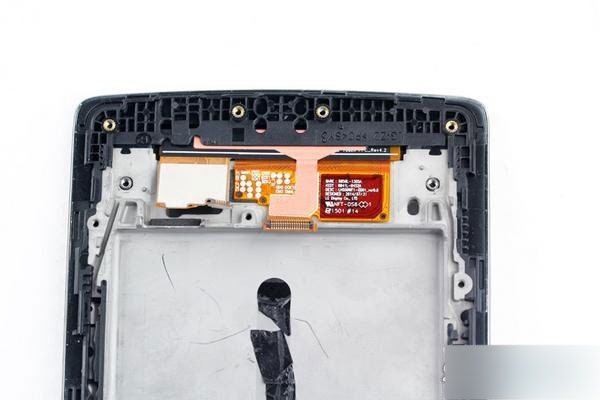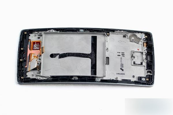 取下中框上为数不多的剩余部件后来看看中框,整个中框采用镁铝合金材料制成,来自LG Display的5.5英寸型号为LH550WF1-ED01的POLED屏通过4颗螺丝和少许粘胶固定在中框上,中框背面还有7可热烫螺母,顶部还有一颗降噪麦克风排线。G Flex2采用了Synaptics的S3528A触控芯片。
