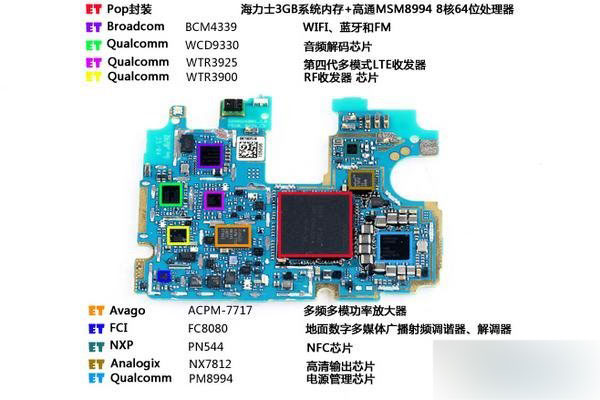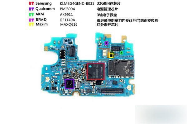 最后让我们来看看G Flex2主板芯片布局吧,PCB板制造商依然是LG自己,主板正面顶部集成一颗来自Avago的光线距离感应器,旁边有一颗红外LED,主要芯片如下图。
