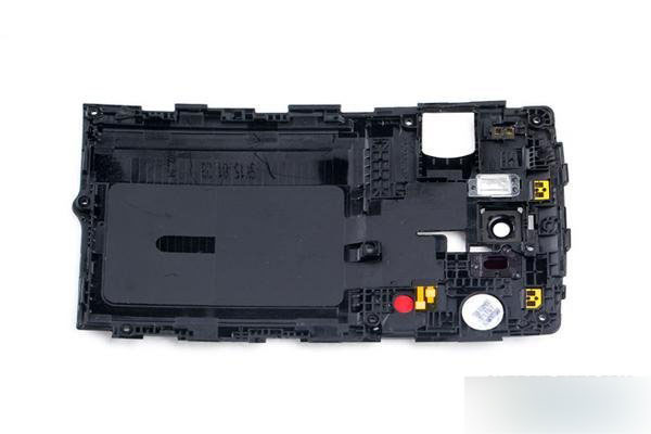 整个后盖内部完全不同于上一代,内部光秃秃的什么也没有,只有侧边固定后盖的卡扣,和激光雕刻的材料成分比例,经过分析整个后盖采用聚碳酸酯材料+ABS工程塑料制成。