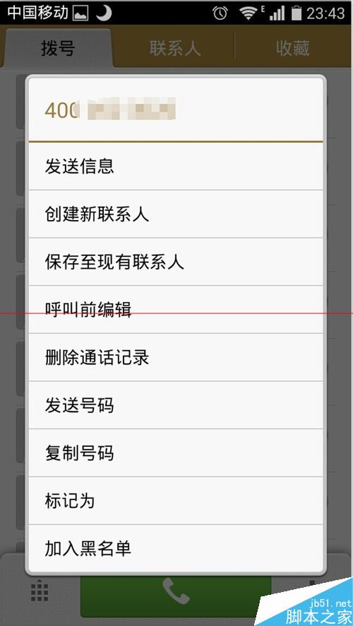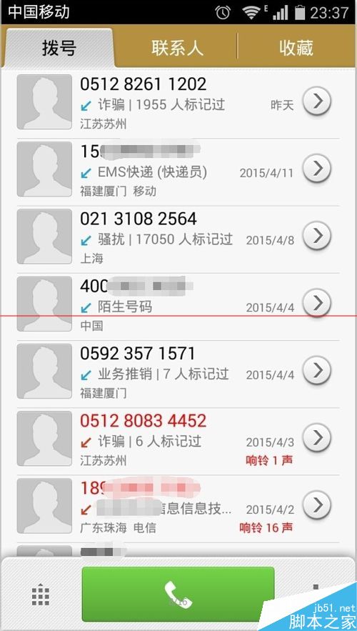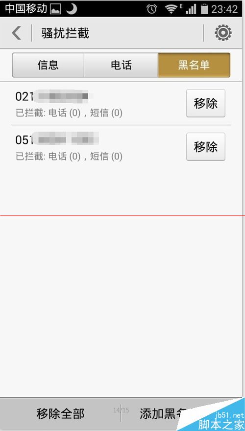 5、当然罗。。不断增加的电话号码。。我们也可以直接从通话记录进行黑名单管理操作。