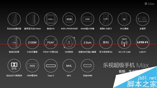 初看乐Max的背部会觉得有些凌乱,大面积的信号带颇有iPhone6的风格,火山口似的2100万像素摄像头和指纹识别区域的布局有些华为Mate7的影子。而乐Max背部摄像头左侧还有一个区域写的是”HDMI“模块,该功能实现了低延时高速无线传输1080P超高清视频的功能。机身下方则为乐视的品牌logo。