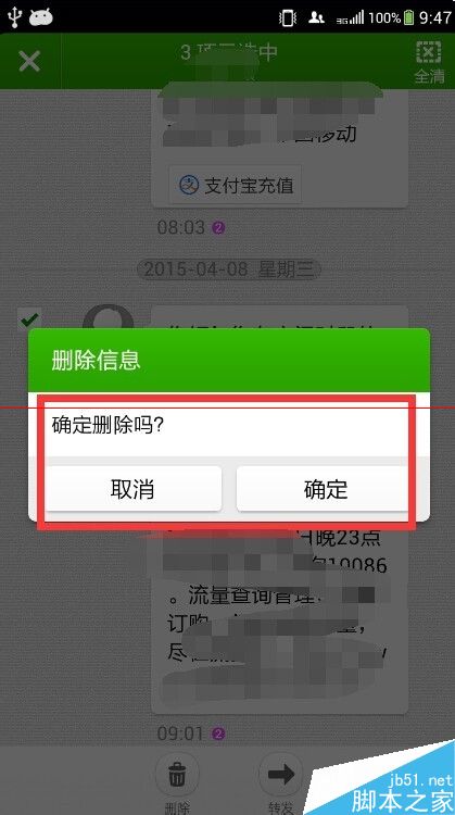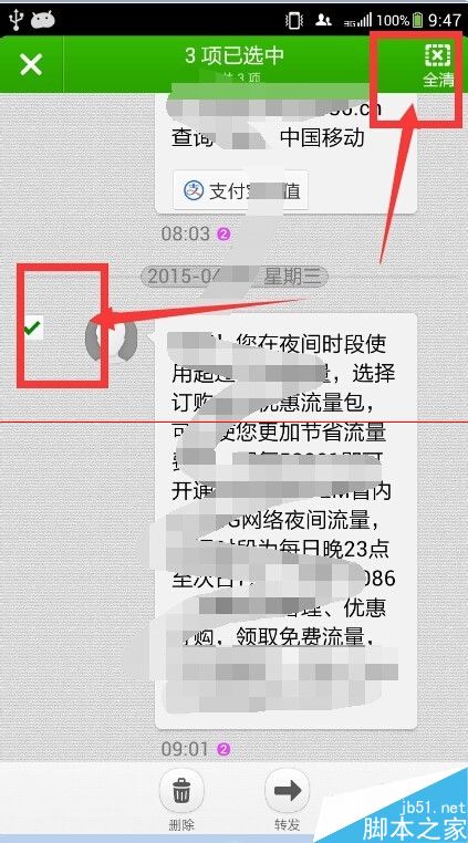 6、我们再次点击右上角的“全选”后,右上角的字符变成了“全清”,所有的短信都被选中了。