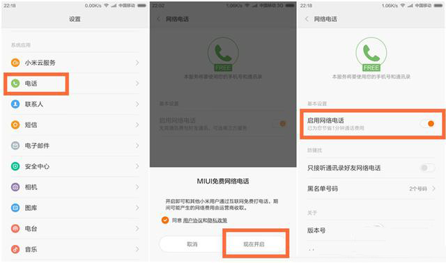 小米手机MIUI免费电话开启方法: