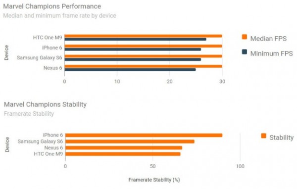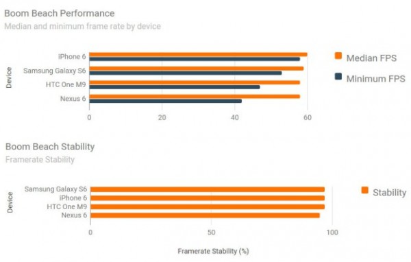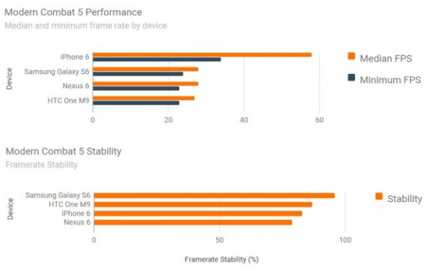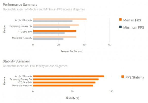 但是当涉及到游戏性能,测试结果完全不同,并且会让人大吃一惊。GameBench周三公布了一系列游戏深度测试,比较了四大智能手机游戏性能结果,其中包括iPhone 6,GalaxyS6,HTC One M9和谷歌的Nexus 6。看上去四核和八核智能手机有更快的CPU工作频率和更多的内存,会轻而易举地击败双核1GB内存的iPhone 6,但是实际情况根本不是如此。