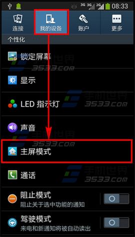 1)打开三星Note2手机【设定】,点击【我的设备】选择【主屏模式】。(如下图)