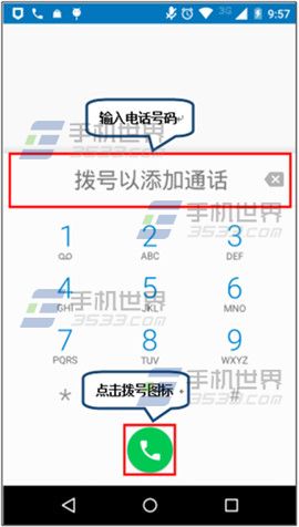 1)在Moto G通话界面中点击【添加通话】,输入电话号码,点击【拨号图标】。(如下图)