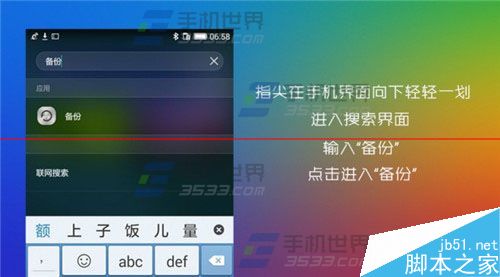 1)进入华为P8搜索界面,输入【备份】,点击并打开搜索结果里的备份。(如下图)