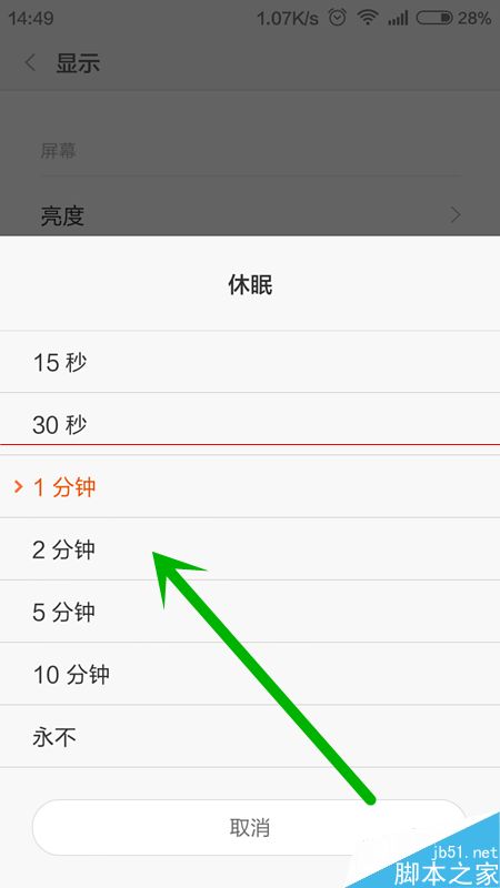 5、点击打开后根据自己的需要,选择自己想让手机屏幕无操作保持亮度的时间(下面以5分钟为例),手机默认的为1分钟无操作就休眠