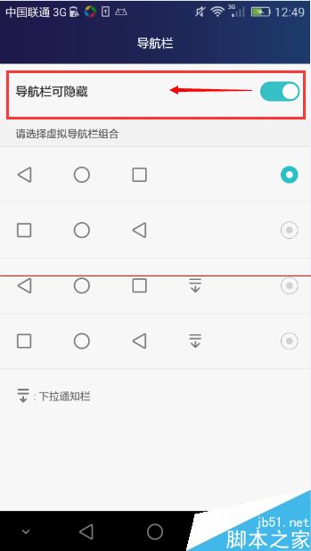 4、进入导航栏界面,这时候会看到‘导航栏可隐藏’项是开着的,向左滑动开关,关闭可隐藏功能。且下面可以设置返回键的位置,有些人不习惯返回在左边的可以在这里选择成右边的。,好了现在用起来是不是好多啦。