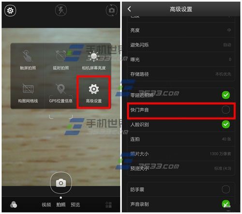 打开酷派大神F2自带的【相机】点击左上角的【设置】选择【高级设置】,将【快门声音】取消勾选即可。(如下图)