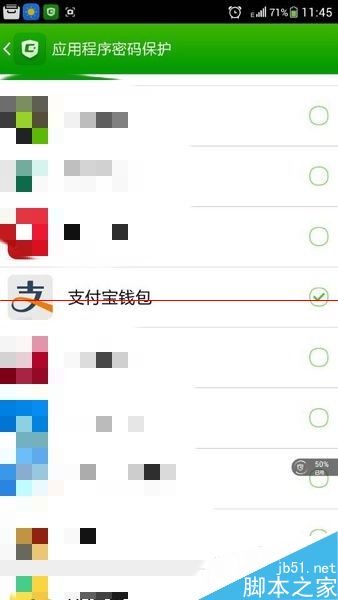 4、就会看到手机上安装的所有应用程序,在想要加密的程序的后方的圆圈打勾。