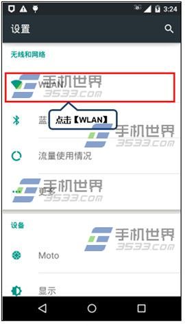 1)打开Moto G【设置】,点击【WLAN】。(如下图)