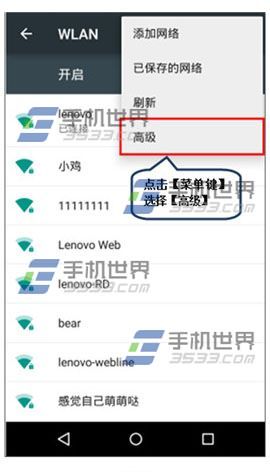 2)将【WLAN】开启,点击【菜单键】选择【高级】。(如下图)