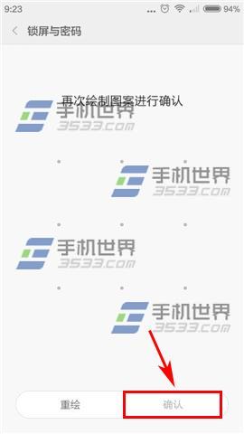 2)进入设置锁界面绘制【锁屏图案】至少需要连接4个点,(可以点击使用其他密码类型设置数字密码或混合密码)锁屏密码绘制完成后会自动跳转另外一个界面然后【再绘制一次】你第一次绘制的密码即可。(如下图)