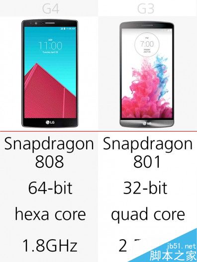 处理器:G3采用了32位的骁龙四核801,主频为2.5GHz;G4升级到了64位的骁龙6核808,主频为1.8GHz。至于没有选用810的主要原因,大家都知道的(太烫了)。
