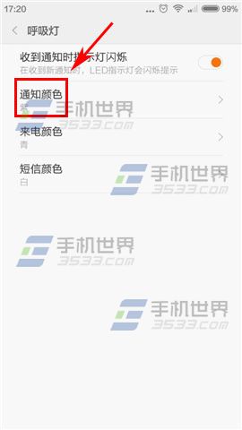 2)进入后有通知和来电以及短信的呼吸灯颜色,小编就拿【通知颜色】举例,点击进入后选择颜色即可;注:其他两种操作方式一样。(如下图)