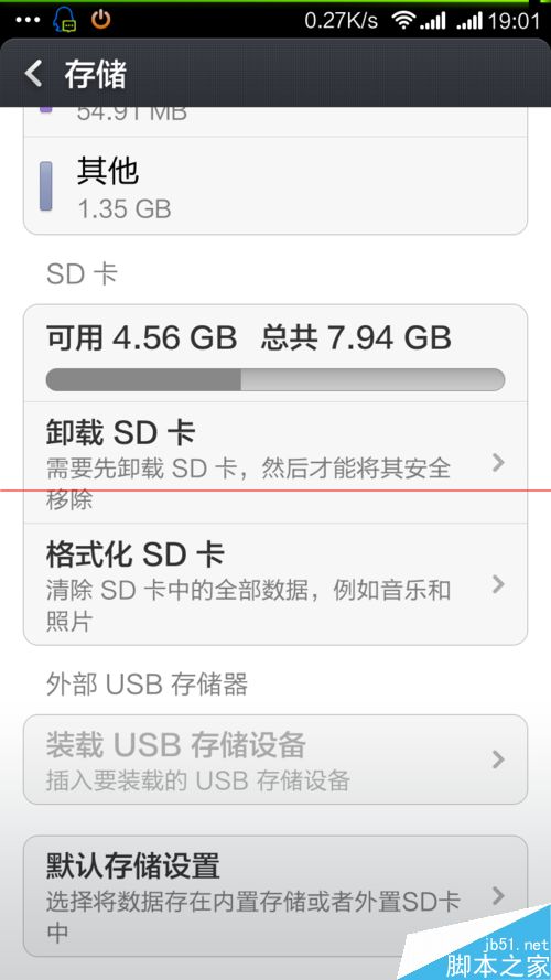 3、盖上手机盖,打开手机。到设置中看存储,检查SD卡手机是否识别,如下图表示手机
