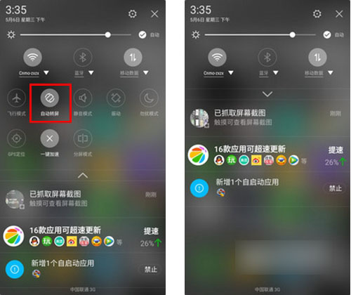 只需在手机待机主界面下,下拉屏幕,然后点击【自动转屏】即可,如下图所示: