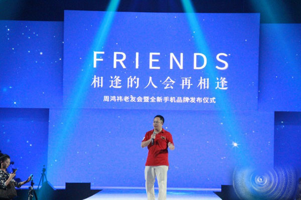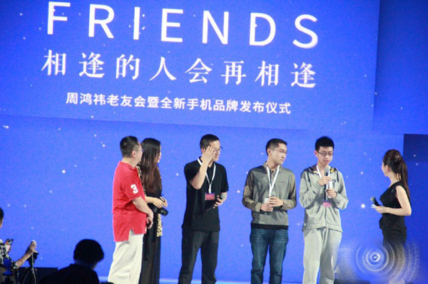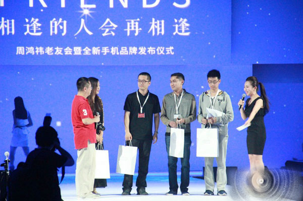 四位嘉宾上台与周鸿祎握手,他们有的是周鸿祎的粉丝,有的是360品牌的拥趸,也有优酷《老友会》节目的成员