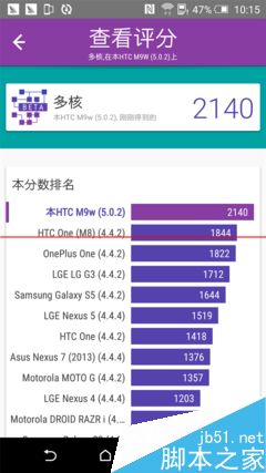 安兔兔综合测试中,M9的分数更胜一筹,分数的主要差距在于单核心的运算速度,骁龙810显然更能适应这一项测试。跑分成绩只是起到参考作用,在实际使用中,两款手机均反应迅速,毫无卡顿。