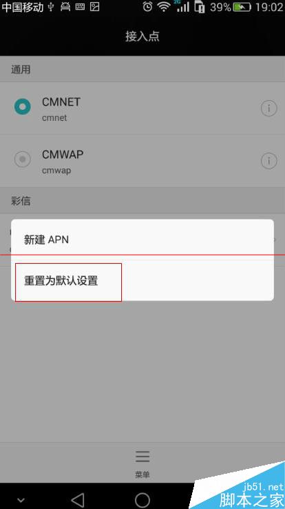 6、进入 设置-》(无线和网络)更多-》移动网络-》(对应卡的) 接入点名称(APN)-》点菜单:重置为默认APN 。