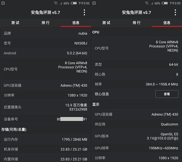 nubia Z9 - 安兔兔评测 64位 - 得分详情与排行