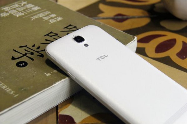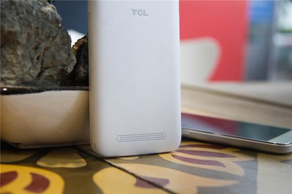 此次图赏为TCL ono全白色版本,正面采用了较为时尚圆润的造型设计,正面上方从左到右依次为光线距离感应器、前置摄像头和听筒。