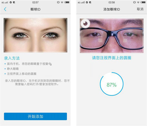 从上面给出的方法可以知道,vivo X5Pro眼球识别设置很简单,我们只需要眼睛盯着一个小圆圈动几下即可,完成之后就可以实现眼球加密应用程序,当你开启程序的时候,只需要扫一下眼睛就可以解锁。