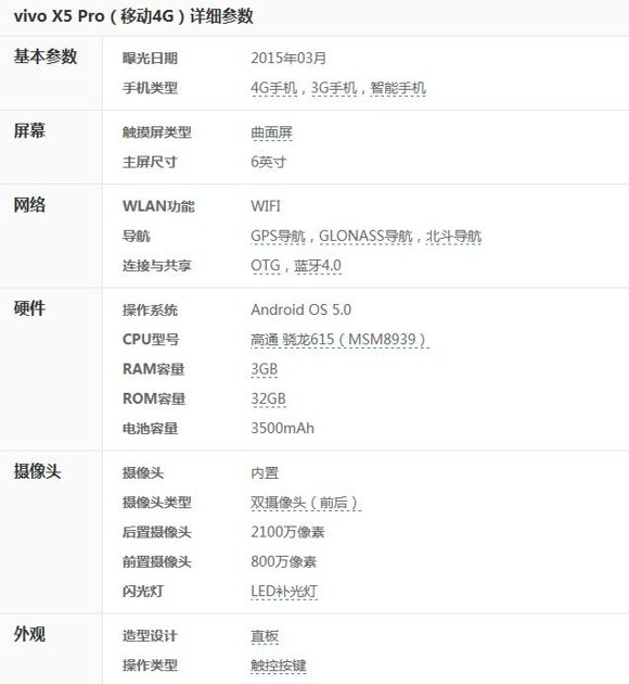 屏幕方面,曝光消息称vivo X5Pro配备5.5英寸1080p Super AMOLED显示屏,主摄像头1300万像素,前置摄像头500万像素,不过vivo X5Pro也可以通过软件实现3200万像素的照片拍摄。此外,曝光称vivo X5Pro还将采用2GB RAM与32GB ROM,电池容量则为3500毫安时或4150毫安时。