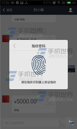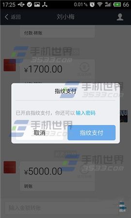 2)按操作提示将支付宝的【指纹密码】开启,开启完后,我们在转帖或者购物时就可以使用【指纹支付】,下面小编以转帐为例:在转帐时点击【指纹支付】。(如下图)