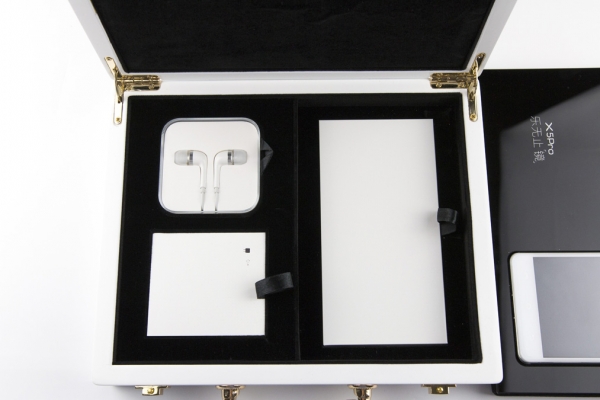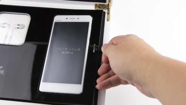 我们直接打开箱子吧,内里能看到的就是 vivo 的 XE600i 耳机和最新的 X5Pro,下方还有 “乐无止境” 的字样。