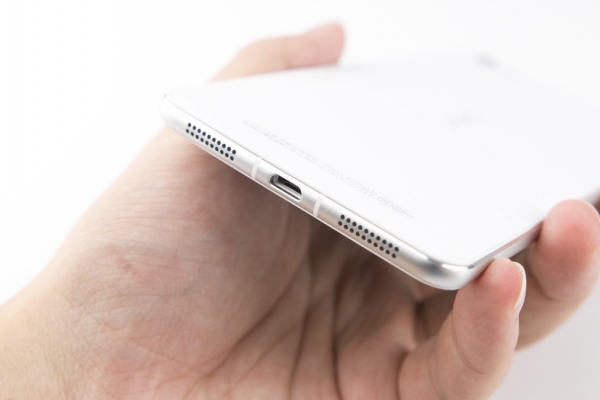 底部的左边是麦克风,右边才是扬声器,中央是 USB 接口,接口两侧是白色的天线隔断条。