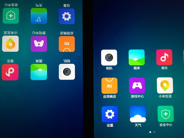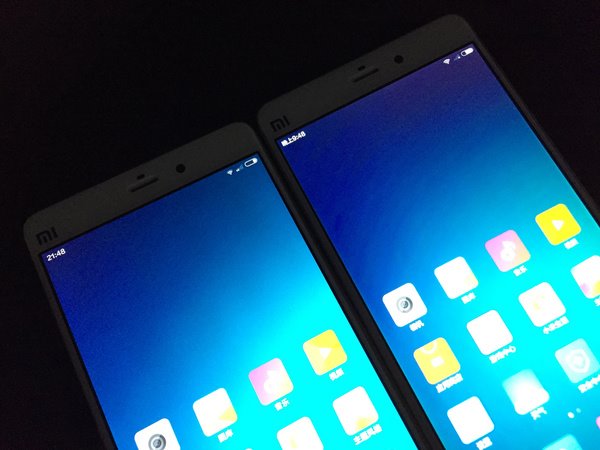 其次是颜色和亮度差异。小米Note顶配版屏幕看起来比普通版要“死板”一些,普通版的亮度偏高,图标的显示效果比较活泼,而顶配版的色调相对稳重。这些差距不用专业测试也能清楚辨别,喜欢哪种类型还是需要亲身体会才知道