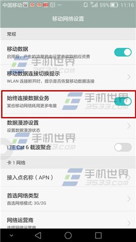 2)将移动数据的【始终连接数据业务】开启。如果你是在wifi情况下的话请在【设置】中点击【WLAN】。(如下图)
