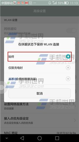 3)点击【高级设置】,将【在休眠状态下保持WLAN连接】调整为【始终】。(如下图)