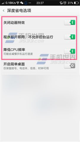 2)找到【深度省电选项】,手机世界小编在此建议大家开启以下三项:【关闭动画特效】,【程序即开即用,不允许后台运行】以及【降低CPU频率】,从而达到最佳省电效果。(如下图)
